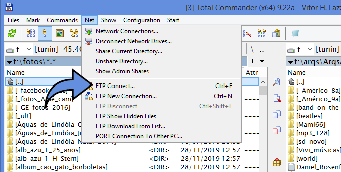 Quando clicamos em "Connect", um das faces da tela do programa mostrará os diretórios, ou nossas "gavetas" do "armário" que temos em nosso "quarto" lá no "hotel" em que estamos "hospedados" na Internet.